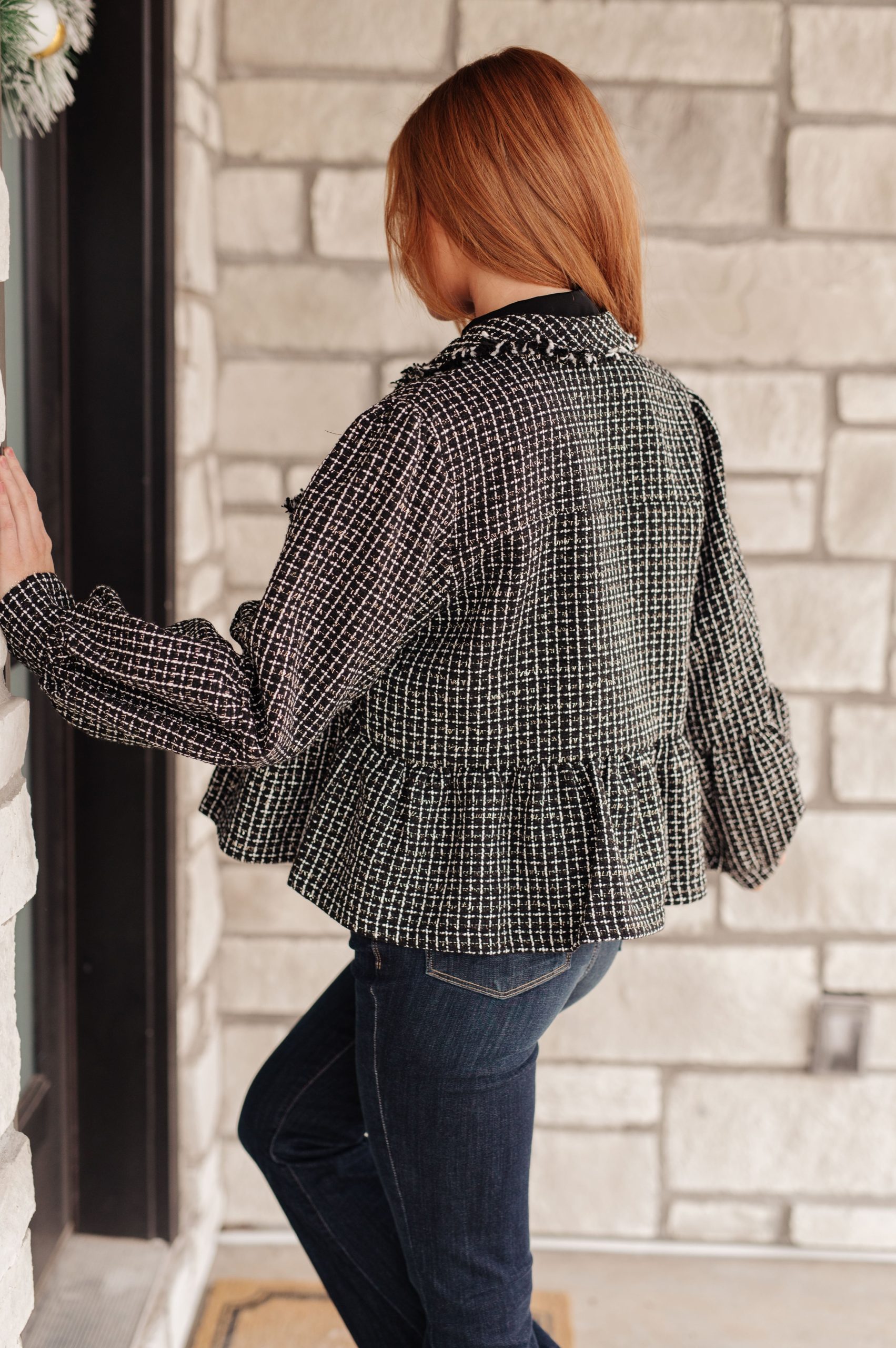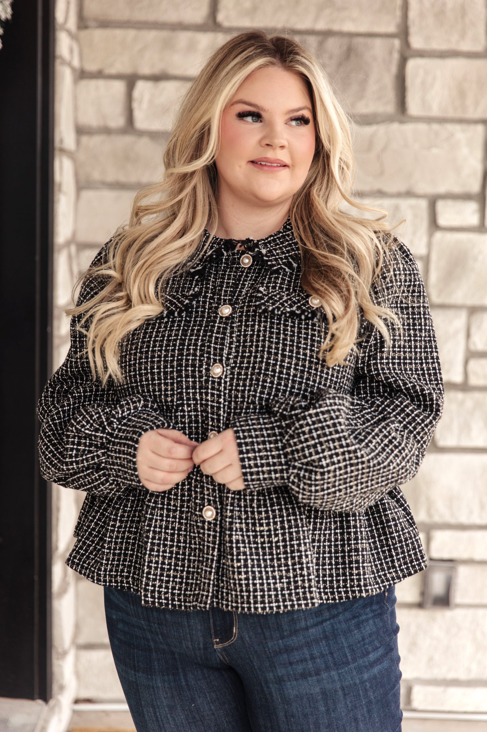 The snappy Number Five Tweed Jacket is sure to be the life of the party! Its lightweight tweed and raw edge details provide a stylish look. Plus, its peplum style and faux pearl buttons add the perfect touch of chic. So, slip into this chic jacket and turn heads at your next outdoor gathering!